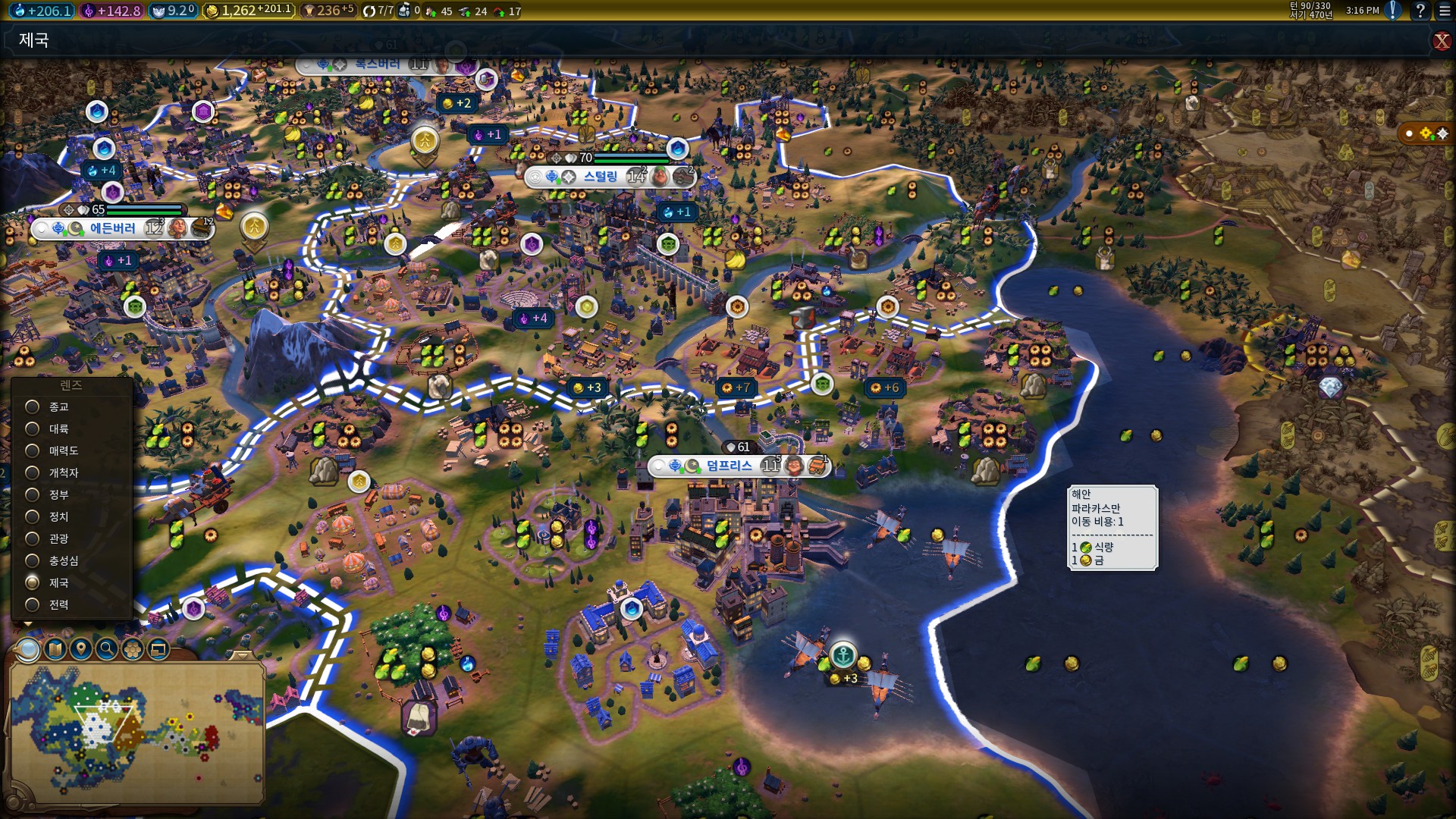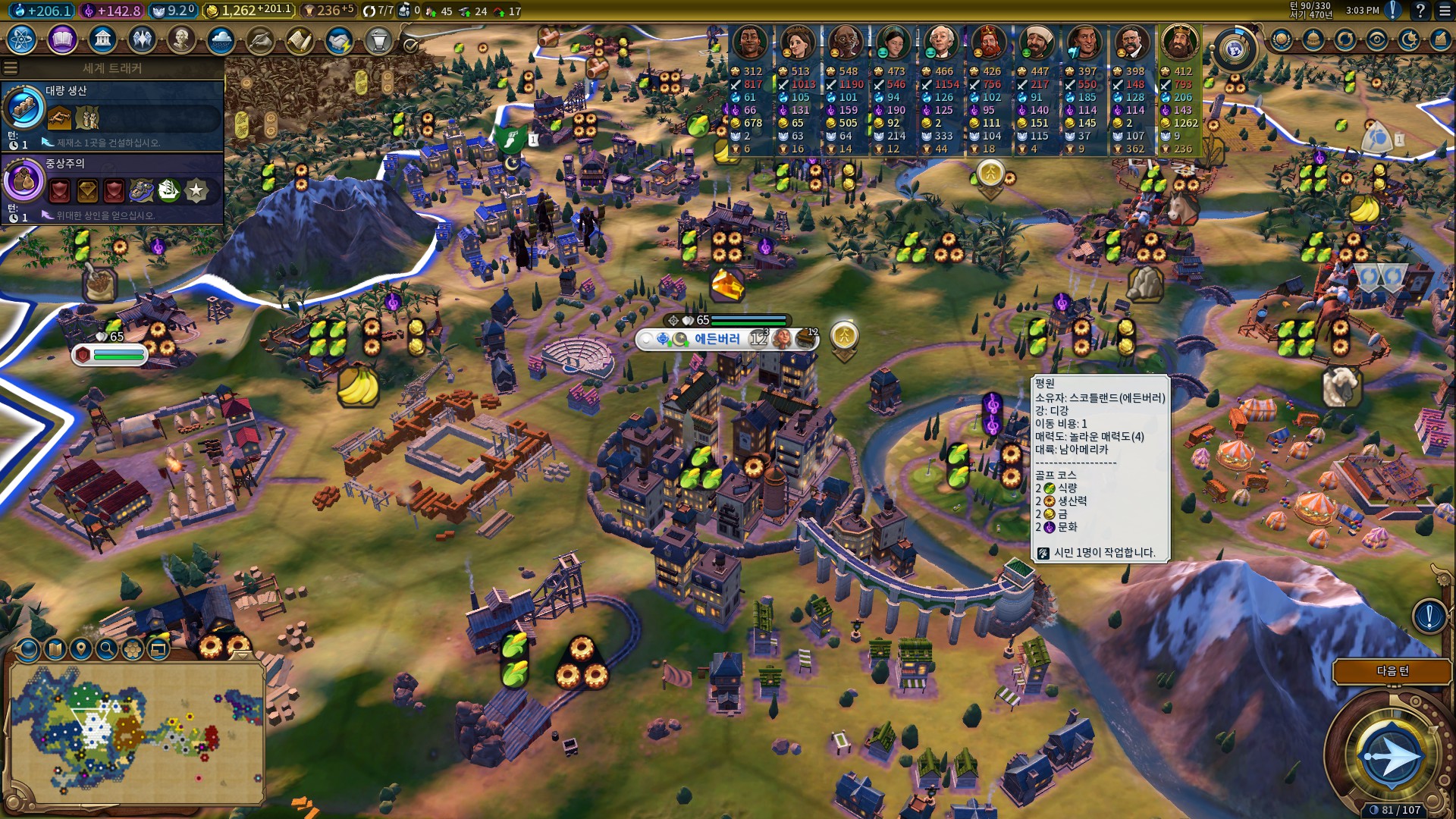 사치자원 넷을 확보할 수 있는 멀티자리 전략 자원과 사치 자원을 AI 문명에게 팔면 다량의 골드를 벌 수 있다. 이 골드를 신생 도시에 투자하면 어마어마한 내정 이득으로 이어진다. 앞으로 소개할 최적 내정의 핵심은 사실 이것이다. 생산은 골드와 내부 교역으로도 해결할 수 있으니 송산댐 중독에서 벗어나 캠퍼스와 극장가를 더 빨리 지을 것을 권장한다. 자세한 내용은 차후에 소개토록 하겠다.